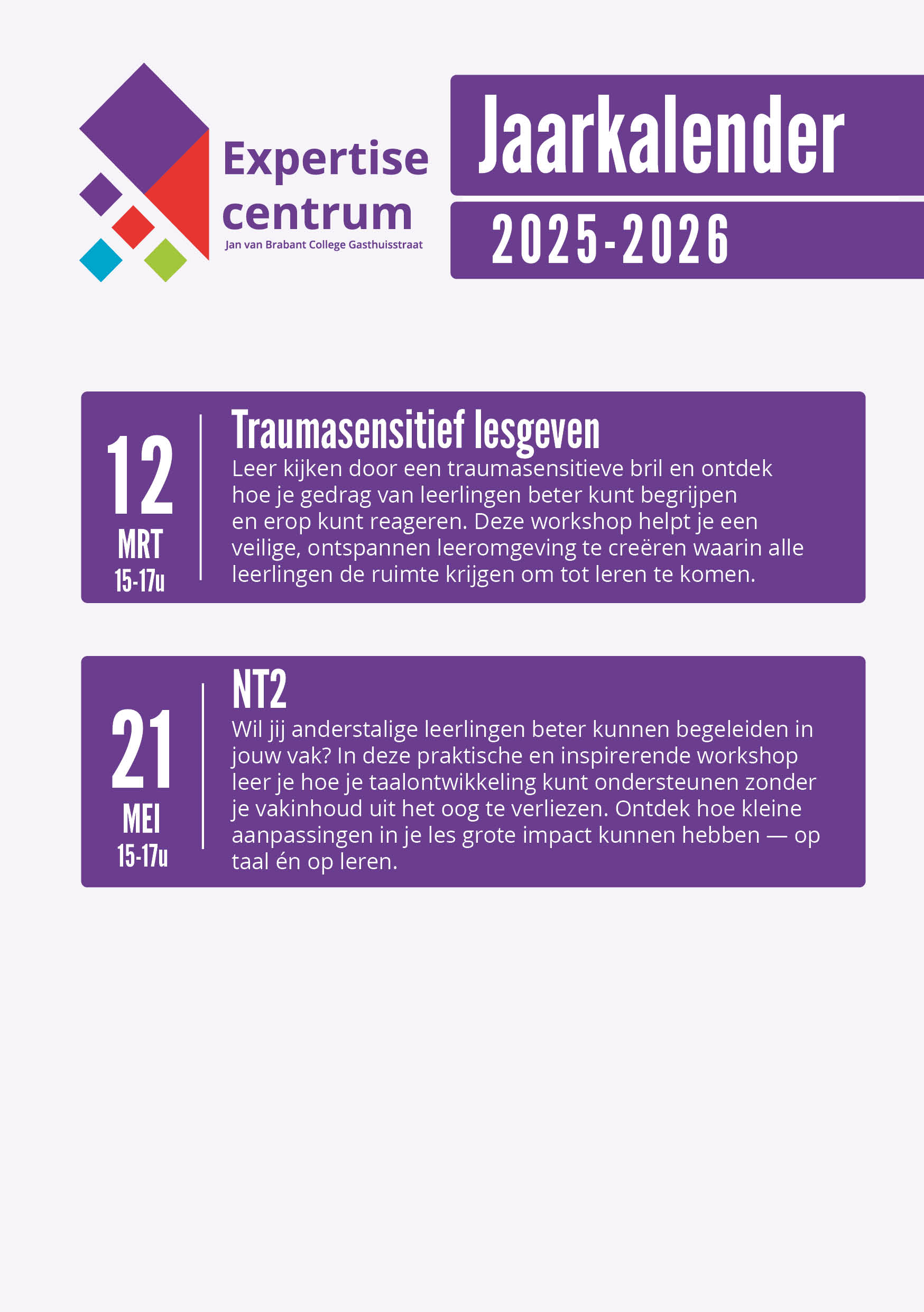 Maak het verschil voor NT2-leerlingen – volg onze inspirerende workshops! Ons expertisecentrum biedt een reeks interactieve workshops aan om NT2-leerlingen een warme en soepele start te geven. Tijdens deze sessies krijg je praktische tips, verdiepende inzichten en direct toepasbare tools op het gebied van traumasensitief lesgeven, cultuursensitief onderwijs en NT2-begeleiding. Samen versterken we het vertrouwen, de veerkracht en het leerplezier van onze leerlingen – én het vakmanschap van elke docent. Schrijf je hieronder in voor de workshops die bij jou (of je team) passen!